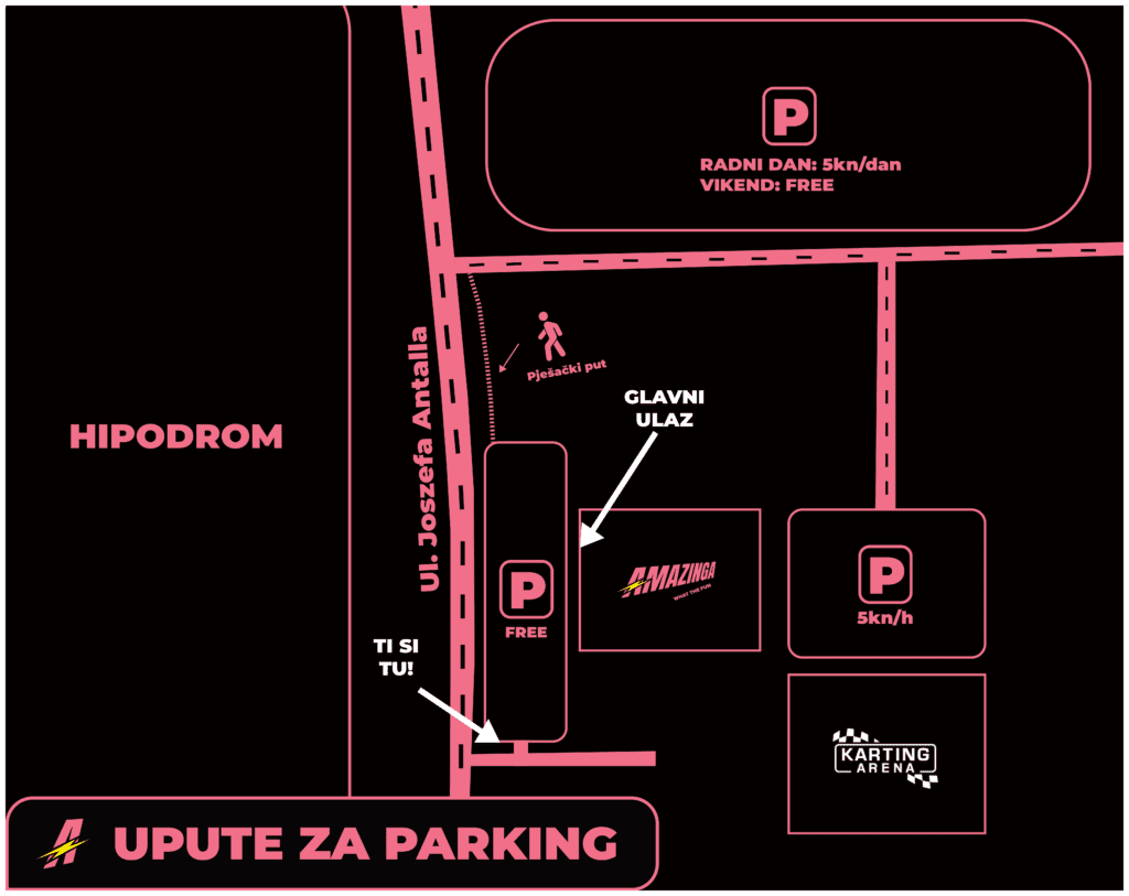 Za sve posjetitelje koji dolaze automobilom, Amazinga ima osiguran besplatan parking kojemu pristupaš izravno s ulice Joszefa Antalla (nasuprot tribine Hipodroma).